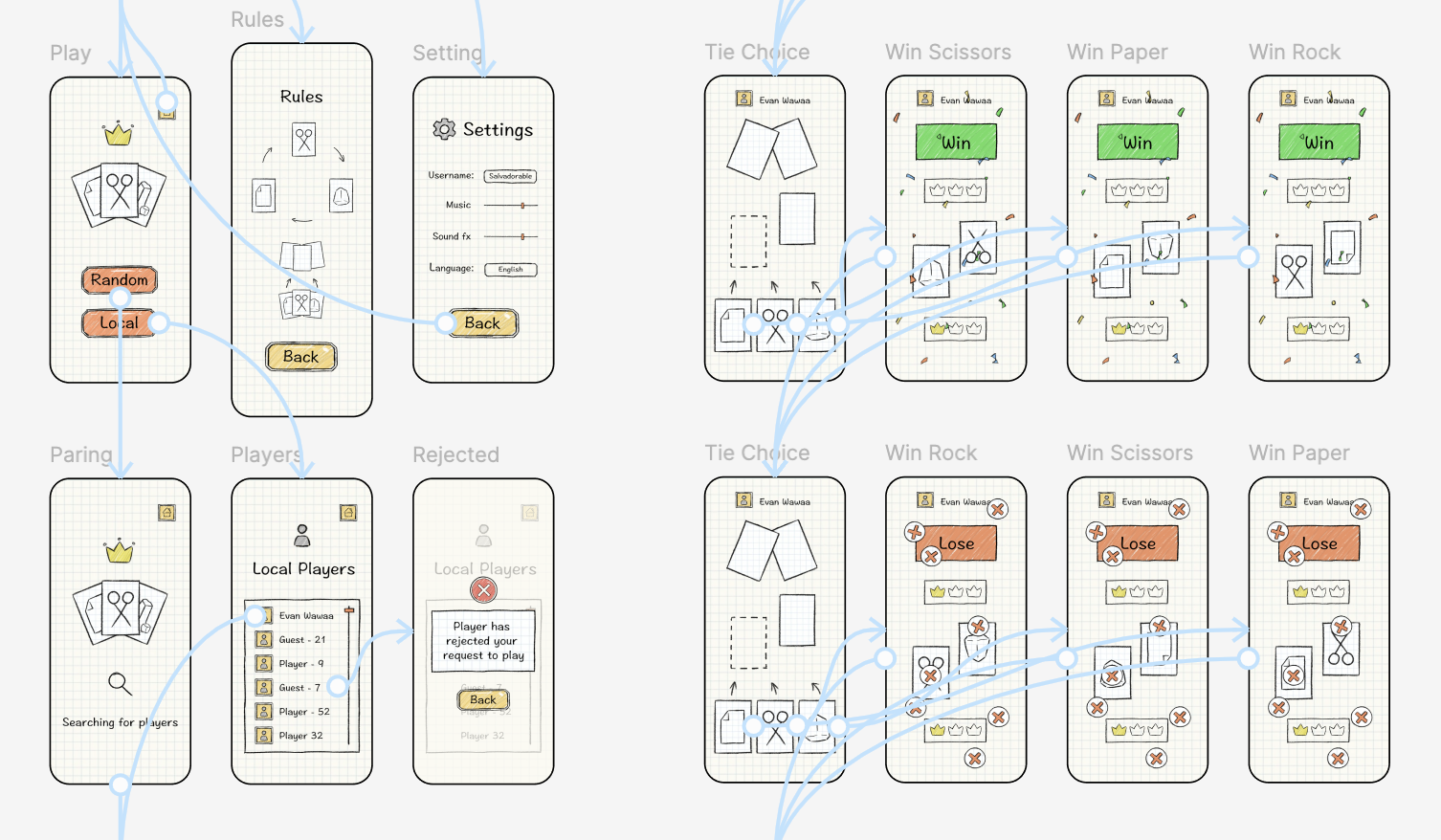 Designing a mobile app for the game Rock Paper Scissors. Designing the flow of the app and connecting the pages by wireframing in Figma.